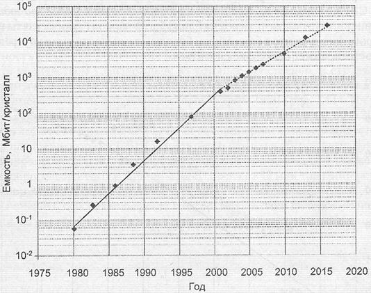 Плотность упаковки запоминающих элементов на кристалле динамического ОЗУ принято характеризовать емкостью хранимой информации в битах. Представление о современном состоянии и перспективах на ближайшее будущее дает график, приведенный на рис. 1.13. Для СБИС памяти также подтверждается справедливость закона Мура и предсказанное им уменьшение темпов повышения плотности упаковки. В целом можно предсказать, что число запоминающих элементов на кристалле будет возрастать в два раза каждые полтора года.