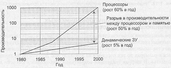 С быстродействием СБИС памяти дело обстоит хуже. Высокая скорость процессоров уже давно находится в противоречии с относительной медлительностью запоминающих устройств основной памяти. Проблема постоянно усугубляется несоответствием темпов роста тактовой частоты процессоров и быстродействия памяти, и особых перспектив в этом плане пока не видно, что иллюстрирует рис. 1.14.