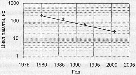 Абсолютные темпы снижения длительности цикла памяти, начиная с 1980 года, показаны на рис. 1.15. Общая тенденция: на двукратное уменьшение длительности цикла динамического ЗУ уходит примерно 15 лет.