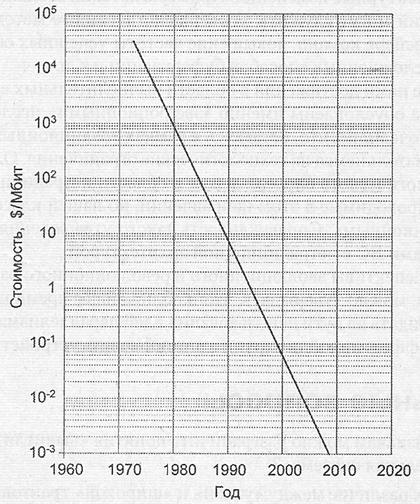 В плане снижения стоимости СБИС памяти перспективы весьма обнадеживающие (рис. 1.16). В течение достаточно длительного времени стоимость в пересчете на один бит снижается примерно на 25-40% в год.