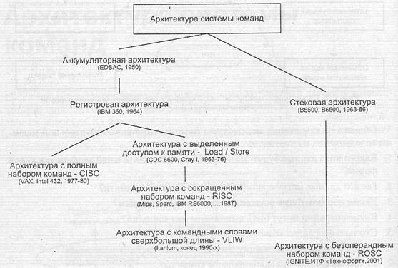В истории развития вычислительной техники как в зеркале отражаются изменения, происходившие во взглядах разработчиков на перспективность той или иной архитектуры системы команд. Сложившуюся на настоящий момент ситуацию в области АСК иллюстрирует рис. 2.3.