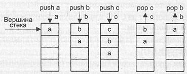 Верхнюю ячейку называют вершиной стека. Для работы со стеком предусмотрены две операции: push (проталкивание данных в стек) и pop. (выталкивание данных из стека). Запись возможна только в верхнюю ячейку стека, при этом вся хранящаяся в стеке информация предварительно проталкивается на одну позицию вниз. Чтение допустимо также только из вершины стека. Извлеченная информация удаляется из стека, а оставшееся его содержимое продвигается вверх. В вычислительных машинах, где реализована АСК на базе стека (их обычно называют стековыми), операнды перед обработкой помещаются в две верхних ячейки стековой памяти. Результат операции заносится в стек. Принцип действия стековой машины поясним на примере вычисления выражения а = а + b + а×с.