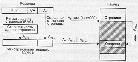 Страничная адресация (СТА) предполагает разбиение адресного пространства на страницы. Страница определяется своим начальным адресом, выступающим в качестве базы. Старшая часть этого адреса хранится в специальном регистре — регистре адреса страницы (РАС). В адресном коде команды указывается смещение внутри страницы, рассматриваемое как младшая часть исполнительного адреса. Исполнительный адрес образуется конкатенацией (присоединением) АС к содержимому РАС, как показано на рис. 2.59. На рисунке символ || обозначает операцию конкатенации.