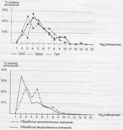 Для команд перехода чрезвычайно важно, насколько далеко адрес перехода отстоит от адреса команды перехода, иными словами, какова типичная величина смещения. В [120] приведены данные о типовой величине смещения, оцененной по программам GCC, Spice, ТеХ; они представлены на рис. 2.62. Результаты, полученные на смесях программ с преимущественной обработкой целочисленных и вещественных данных, показаны на нижнем графике того же рисунка.