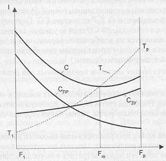 Затратам памяти на рис. 2.64 соответствует кривая СЗУ. Она показывает, что если кодированию алгоритма в терминах операций Fi+1 адекватны затраты памяти СЗУ, то использование более простых операций F 1, …, Fр приводит к увеличению количества команд в программе и СЗУ i+1. > СЗУ, то есть иерархия систем операций Fu Fp имеет следствием иерархию затрат памяти СЗУ1 < СЗУ2 <... < СЗУ р. Характер изменения суммарных затрат оборудования С = С ПР + С ЗУ представлен кривой С. Видно, что существует система операций Fт которой соответствуют минимальные затраты оборудования С. Система операций Fm занимает промежуточное положение между наиболее сложной F1 и наименее сложной Fp системами операций. Наконец, кривая Т демонстрирует, что время выполнения алгоритмов возрастает от минимального значения Т1 (при наиболее сложной СО F1) до максимального значения Тр (при наименее сложной СО Fp).