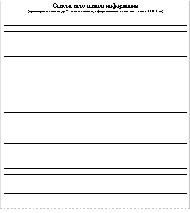 3.Оформитьсписок источников информации, включающий по 5 литературных источников: а) учебник, учебное пособие, книга; б) статья из методического журнала.