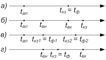 Рассмотрим временные диаграммы функционирования УРЗА (рис. 2.2). Здесь приняты следующие обозначения: tап – момент аппаратного отказа; tКЗ – момент КЗ; t ф – момент отказа функционирования; tВН, ВК – соответственно, моменты начала и завершения восстановительных работ. В случае «а» УРЗА потеряло способность выполнять требуемую функцию в момент tап, что приводит к неотключению КЗ после его возникновения. В случае «б» аппаратный отказ был или выявлен после его возникновения, или обнаружен в ходе регламентных работ, устранен в период времени tВН – tВК, и наступившее КЗ было успешно отключено. В случае «в» аппаратный отказ не обнаружен и каждое КЗ сопровождается отказом функционирования. Случай «г» иллюстрирует отказ функционирования в момент проведения каких-то работ при выведенной на проверку защите.