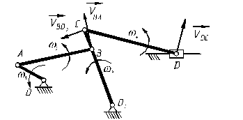 Рис. 16. Схема механизма с указанием направлений относительных линейных скоростей точек и угловых скоростей звеньев.