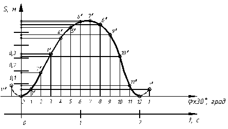 В этом случае параллельно оси φ следует провести ось t. Для определения масштаба времени μt необходимо знать время одного полного оборота кривошипа Т.