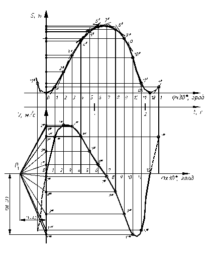 В точках 1´, 2´, 3´… кривой проводим касательные к кривой ѕ(φ). Через Р1 проводим лучи, параллельные соответствующим касательным. Эти лучи отсекут на оси Оv отрезки 0-1´´, 0-2´´, 0-3´´ … пропорциональные аналогам скоростейв соответствующей точке диаграммы.