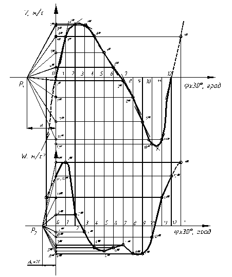 В точках 1´´, 2´´, 3´´, 4´´… кривой проводим касательные к v(φ), а через точку Р2 – лучи, параллельные проведённым касательным. Эти лучи отсекут на оси Оw отрезки 0 – 1´´´, 0 – 2´´´, 0–3´´´, 0-4´´´ … пропорциональные аналогам ускоренийв соответствующей точке диаграммы. Полученные отрезки откладываем на вертикальных прямых диаграммы w(φ). Соединяя точки 11´´´, 0´´´, 1´´´ … и т.д. плавной кривой, получаем диаграмму w(φ) (рис. 25).