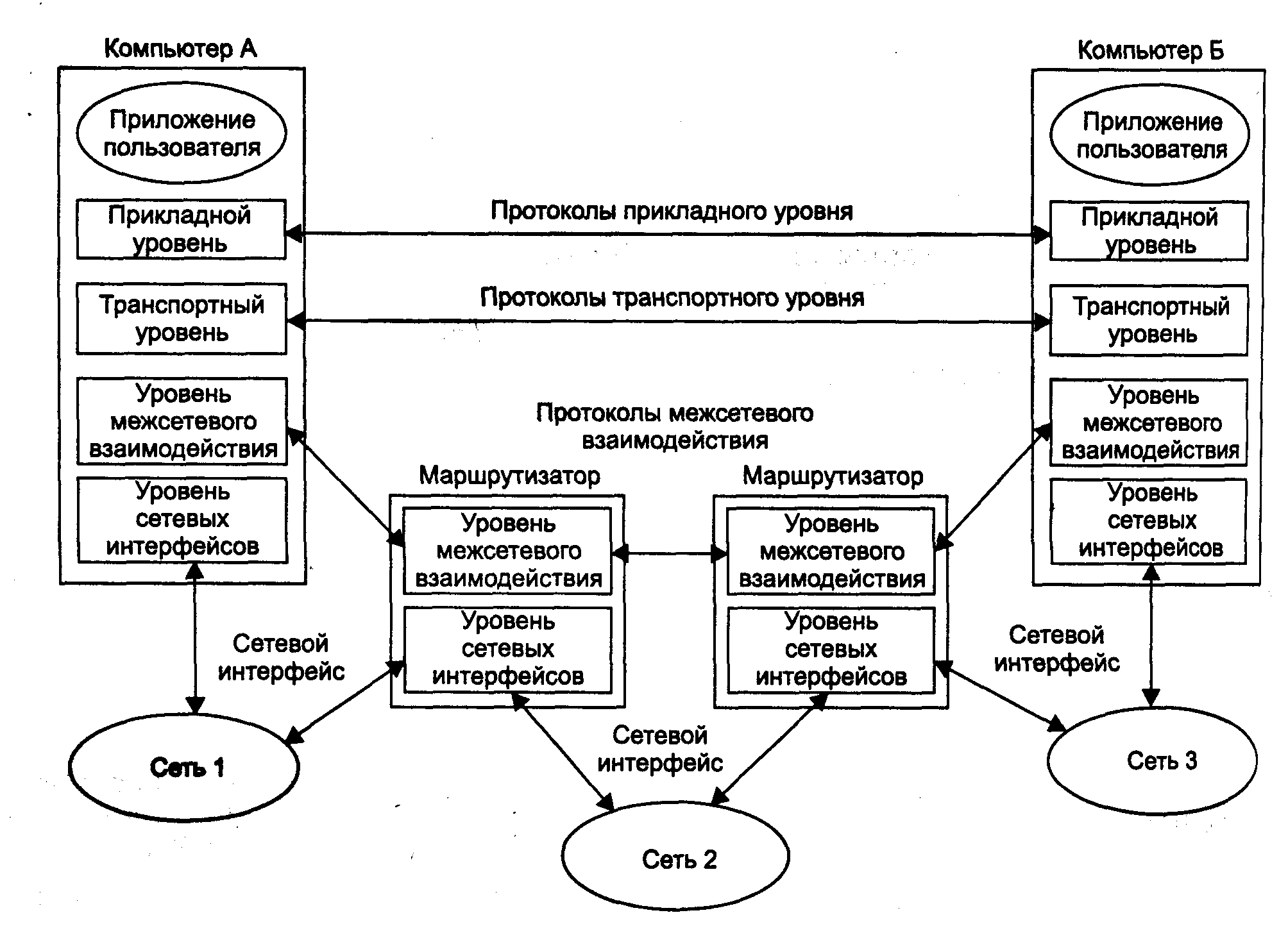 Протоколы прикладного уровня стека TCP/IP работают на компьютерах, выполняющих приложения пользователей. Даже полная смена сетевого оборудования в общем случае не должна влиять на работу приложений, если они получают доступ к сетевым возможностям через протоколы прикладного уровня. Протоколы транспортного уровня уже более зависят от сети, так как они реализуют интерфейс к уровням, непосредственно организующим передачу данных по сети. Однако, подобно протоколам прикладного уровня, программные модули, реализующие протоколы транспортного уровня, устанавливаются только на конечных узлах. Протоколы двух нижних уровней являются сетезависимыми, а следовательно, программные модули протоколов межсетевого уровня и уровня сетевых интерфейсов устанавливаются как на конечных узлах составной сети, так и на маршрутизаторах.