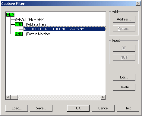 5. Запустите программу Microsoft Network Monitor. Настройте фильтр для захвата пакетов, передаваемых между Вашим и всеми другими компьютерами сети. В качестве разрешенных к захвату протоколов укажите только протокол ARP (см. рисунок).