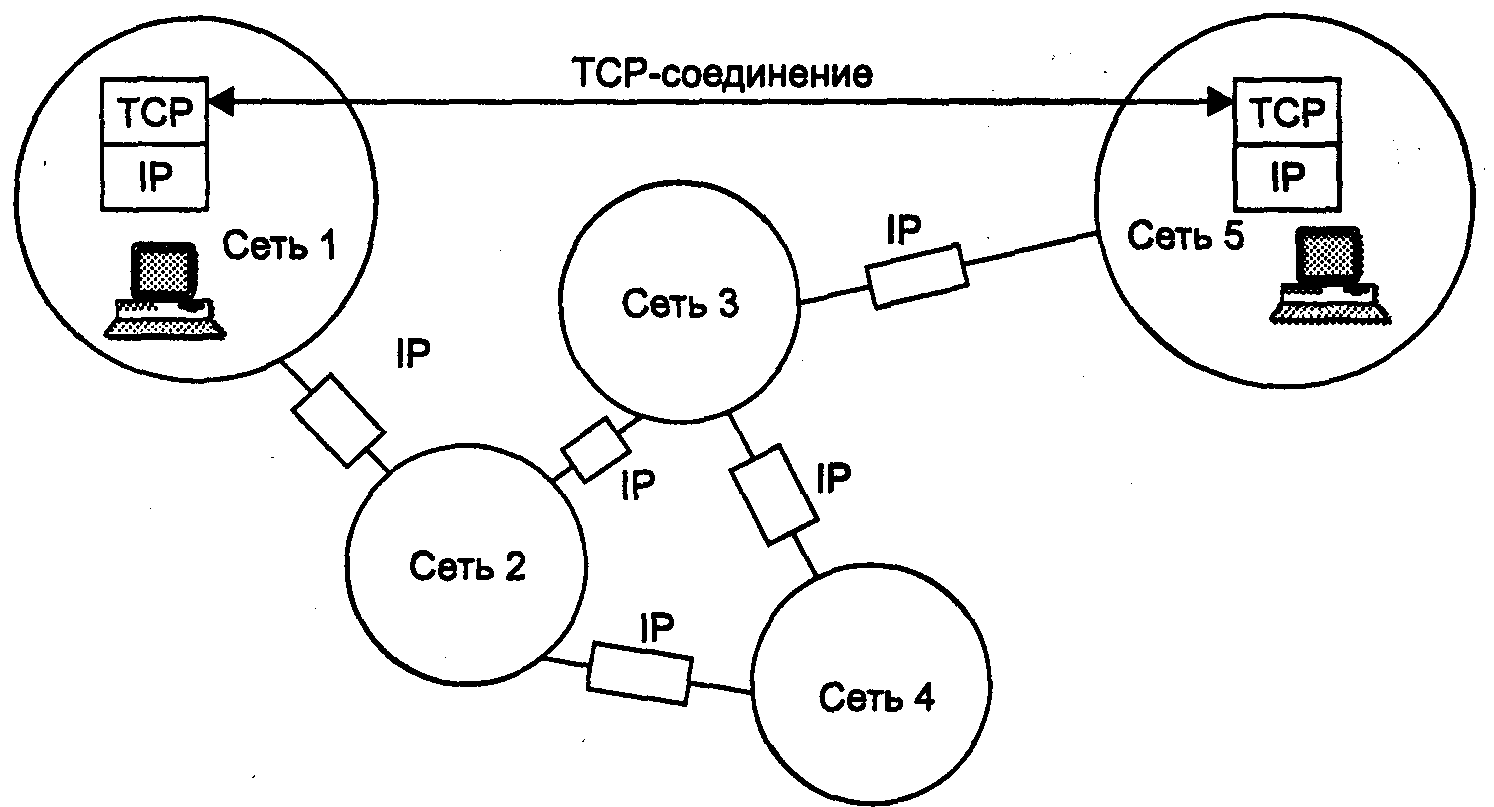 На рис. показано, как процессы, выполняющиеся на двух конечных узлах, устанавливают с помощью протокола TCP надежную связь через составную сеть, все узлы которой используют для передачи сообщений дейтаграммный протокол IP.