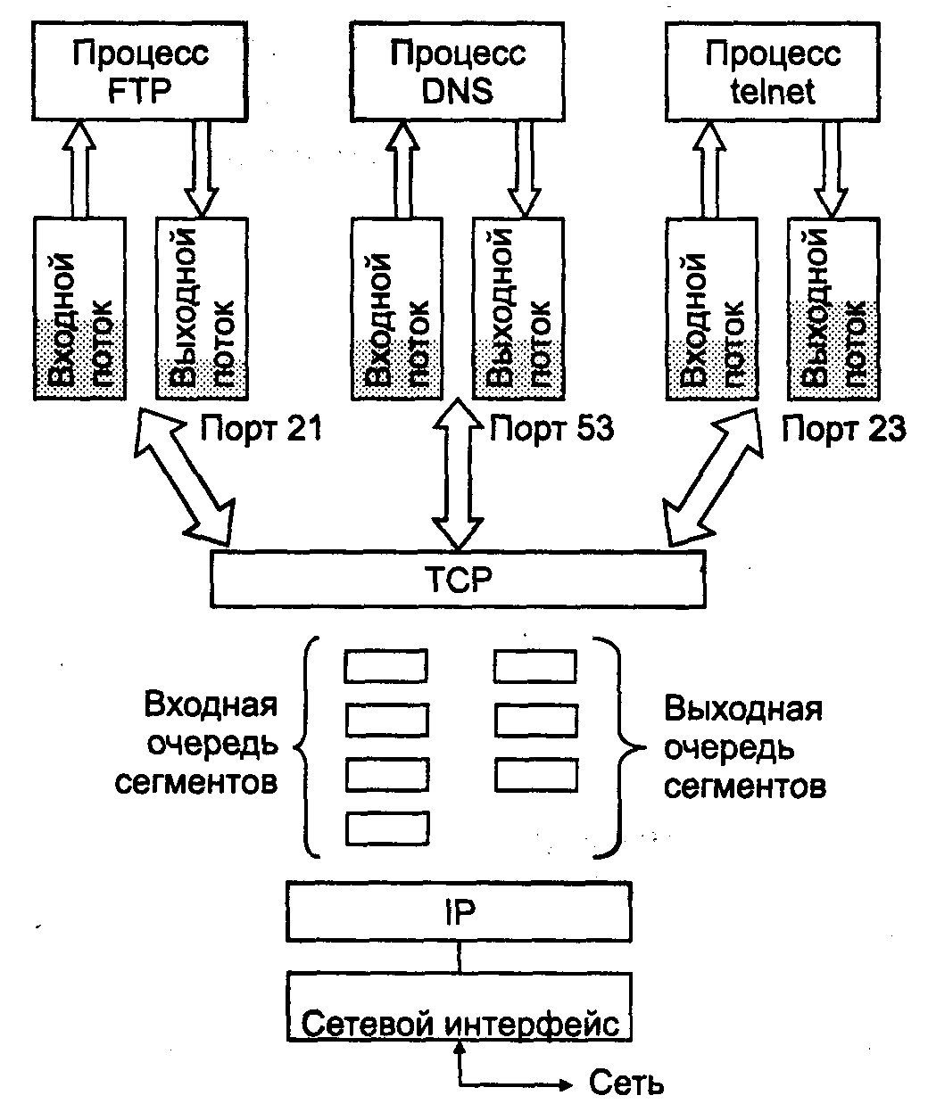 Протокол TCP ведет для каждого порта две очереди: очередь пакетов, поступающих в данный порт из сети, и очередь пакетов, отправляемых данным портом в сеть. Процедура обслуживания протоколом TCP запросов, поступающих от нескольких различных прикладных служб, называется мультиплексированием. Обратная процедура распределения протоколом TCP поступающих от сетевого уровня пакетов между набором высокоуровневых служб, идентифицированных номерами портов, называется демультиплексированием.