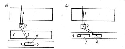 Рис. 14.1. Принципиальные схемы монтажа со склада и с транспортных средств: а - монтаж со склада; б - то же, с транспортных средств; 1 - возводимое здание; 2 - кран; 3 -склад конструкций; 4 - дорога; 5 - тягач с полуприцепом под разгрузкой; 6 - полуприцеп после монтажа с него конструкций; 7-постановка полуприцепа с конструкциями под кран | Приведенная структура процесса монтажа строи-тельных конструкций являет-ся обобщающей и в каждом конкретном случае может быть уточнена в сторону увеличения или уменьшения подлежащих выполнению отдельных операций и процессов. Монтаж строительных конструкций (с точки зрения его организации) может быть осуществлен по двум схемам: монтаж со склада и монтаж странспортных средств (рис. 14.1). |