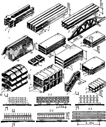 Рис. 14.2. Складирование железобетонных (а) и металлических (б) конструкций: / - подкладки; 2 - прокладки; 3 - металлические опоры; 4 - кассета