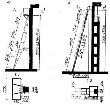 а - железобетонных; б - стальных; 1 - приставная лестница; 2 - навесная лестница; 3 - навесные подмости; 4 - страховочный канат; 5 - инвентарные распорки; 6 - навесные люльки
