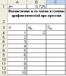 Упражнение 3: Составьте таблицу, вычисляющую n-й член и сумму арифметической прогрессии. Формула n-го члена арифметической прогрессии: an=a1+d(n-l) и формула суммы п первых членов арифметической прогрессии: Sn=(a1+an)*n/2, где a1 - первый член прогрессии, a d — разность арифметической прогрессии, используя абсолютную ссылку. Первый член, который равен -2, а разность равна 0,725.
