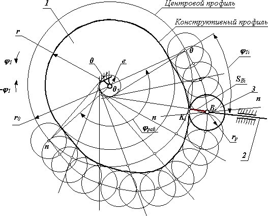 конструктивный профиль кулачка получаем как огибающую к множеству положений ролика толкателя.