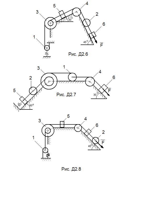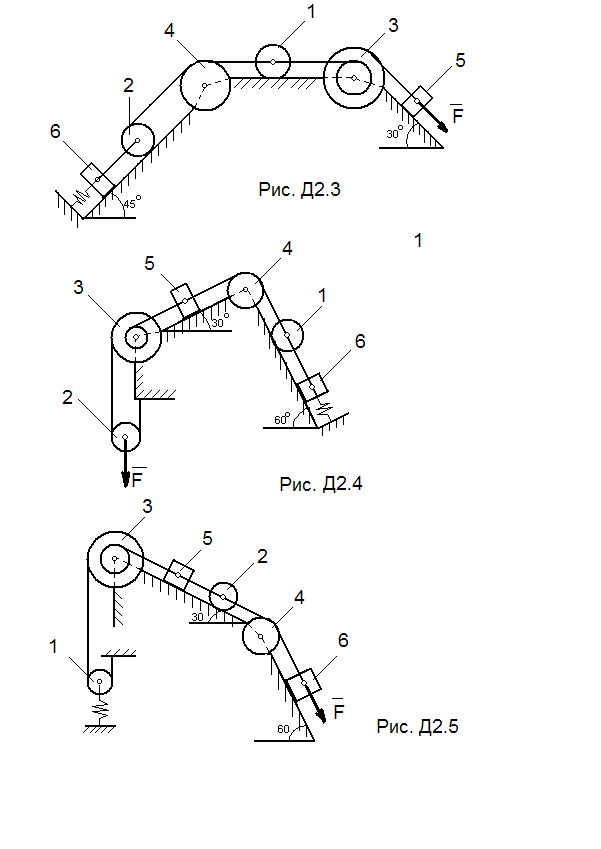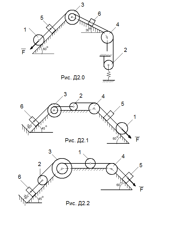 Если по заданию массы грузов 5 и 6 или массы катков 1 (рис. Д 2.0-2.4) и 2 (рис. Д 2.5-2.9) равны нулю, то на чертеже их можно не изображать.