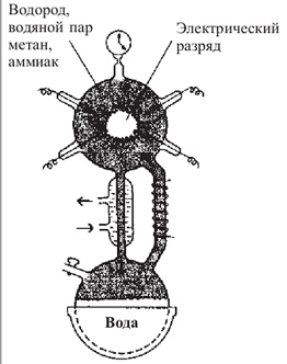 В 1953 г. молодой американский исследователь, студент- дипломник Чикагского университета Стенли Миллер воспроизвел в стеклянной колбе с впаянными в нес электродами первичную атмосферу Земли, которая, по мнению ученых того времени, состояла из водорода метана СН4, аммиака NH, и паров воды Н20 (рис. 2.4.1.2). Через эту газовую смесь С. Миллер в течение недели пропускал электрические разряды, имитирующие грозовые. По окончании эксперимента в колбе были обнаружены α-аминокислоты (глицин, аланин, аспарагин, глутамин), органические кислоты (янтарная, молочная, уксусная, гликоколовая), у-оксимасляная кислота и мочевина. При повторении опыта С. Миллеру удалось получить отдельные нуклеотиды и короткие полинуклеотидные цепочки из пяти-шести звеньев.