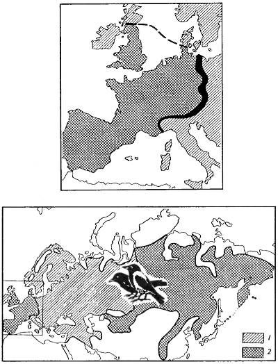 Рис. 9.8. Соприкосновение двух близкородственных форм — черной (Corvus corone) и серой ворон (Corvus corax) без образования широкой гибридной зоны (пример изоляции посредством гибридизации по Э. Майру, 1968). Гибриды оказываются менее жизнеспособными по сравнению с родительскими формами. Судя по неодинаковой ширине гибридной зоны и некоторому колебанию ширины зоны в разные годы, относительная жизнеспособность гибридов, видимо, различна в разных поколениях и частях ареала: 1 — серая ворона; 2 — черная ворона