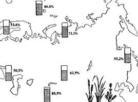 Рис. 13.5. Распространение полиплоидных видов цветковых (в процентах к общему числу видов флоры) в разных частях Евразии (по данным разных авторов из Н.В. Тимофеева-Ресовского и др., 1977)