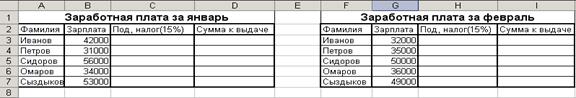 - Создайте на листе Консол. таблицу расчета заработной платы (за январь и за февраль).