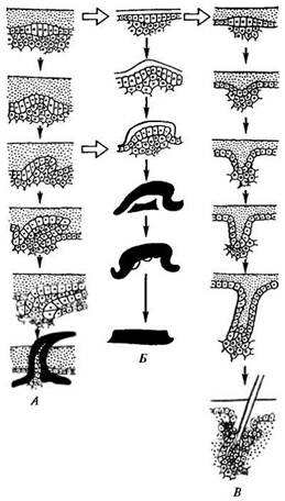 Рис. 14.7. Пример девиации и архаллаксиса. Развитие костных чешуй и волос: А — костная чешуя рыб; Б — роговая чешуя рептилий; В — волос млекопитающего. Одинарные стрелки — анаболия, от А к Б — девиация, от Б к В — архаллаксис. При возникновении волоса группа исходных эпидермальных клеток не выпячивается, а опускается в кожу, в дальнейшем все развитие зачатка не повторяет филогенетического развития чешуи (по А.Н. Северцову, 1939)