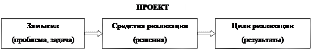 В «Кодексе знаний об управлении проектами»[2] проект – некоторая задача с определенными исходными данными и требуемыми результатами (целями), обуславливающими способ ее решения. Проект включает в себя замысел (проблему), средства его реализации (решения проблемы) и получаемые в процессе реализации результаты (рис. 4).
