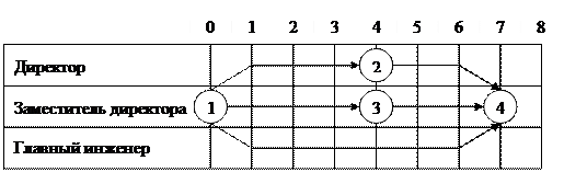Из приведенного примера (рис. 9) видно, что в рамках процесса управления имеют место четыре события, причем событие 1 является исходным, события 2 и 3 - промежуточными, а событие 4 – завершающим. Эти события связаны выполнением работ, причем работы 1-2 и 2-4 выполняются директором, работы 1-3 и 3-4 – его заместителем, а работа 1-4 – главным инженером.