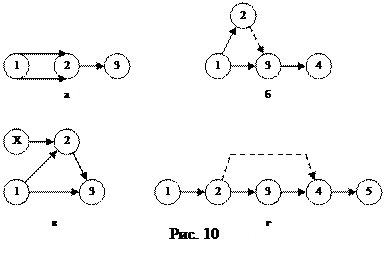 Не допускается обозначение параллельных работ одним и тем же кодом (рис. 10а). Это означает, что между двумя смежными событиями может быть только одна стрелка. В противном случае необходимо ввести в матрицу дополнительное событие и зависимость и отделить ими одну из работ (рис. 10б).