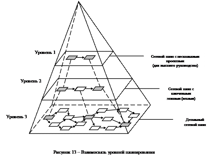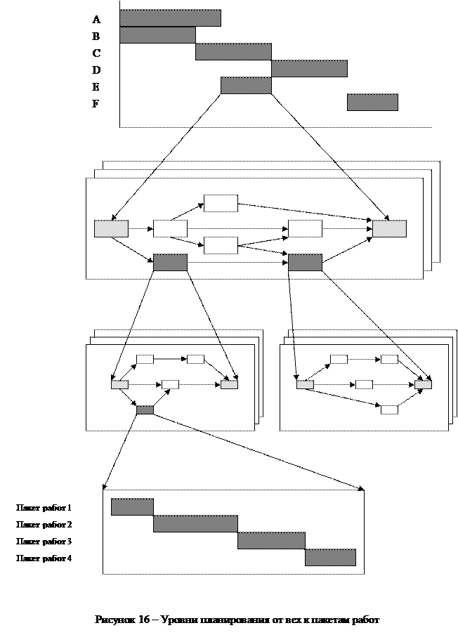 Определение основных вех следует непосредственно после построения СРР и ССО. Вехи удобно использовать для согласования основных стадий, этапов, фаз и т. д., разработки и реализации проекта, а также для анализа и контроля хода реализации проекта на соответствующих этим вехам уровнях управления. Так как для определения вех необходима минимальная, доступная в начале проекта информация, их можно использовать на самых ранних стадиях процесса планирования. На рис. 16 планирование вех составляет начальную, наиболее обобщенную часть плана, который потом развертывается в укрупненный и, наконец, детальный график.