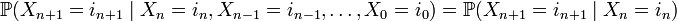 Таким образом, в простейшем случае условное распределение последующего состояния цепи Маркова зависит только от текущего состояния и не зависит от всех предыдущих состояний (в отличие от цепей Маркова высших порядков).