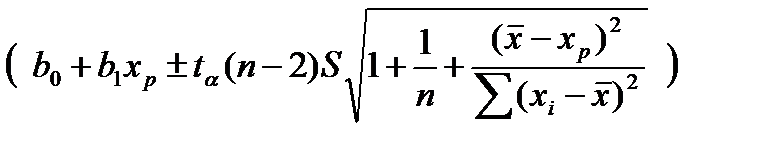 определяет границы, за пределами которых могут оказаться не более 100α% точек наблюдений при Х=хр. Данный доверительный интервал шире доверительного интервала для условного математического ожидания. )