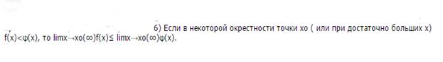 2) Если в некоторой окрестности точки Хо (или при достаточно больших значениях) функция f(x) заключена между 2 функциями g(x) и h(x) имеющими одинаковый предел А при Х стремящемся к Хо(бесконечности) то функция f(x) тоже имеет предел А