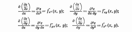 Частные производные функции нескольких переменных являются функциями тех же переменных. Эти функции, в свою очередь, могут иметь частные производные- вторые частные производные (или частные производные второго порядка) исходной функции. Так, например, функция z=f(x,y) двух переменных имеет четыре частных производных второго порядка, которые определяются и обозначаются: