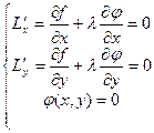 Теорема 5.3 (необходимые условия условного экстремума). Условный экстремум функции z = f (x, y) при наличии уравнения связи φ (х, у) = 0 может достигаться только в стационарных точках функции Лагранжа L (x, y) = f (x, y) + λφ (x, y).