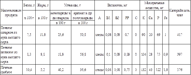 Из таблицы 1.2. следует, что печенье является источником углеводов и обладает высокой энергетической ценностью, а так же хорошей усвояемостью.