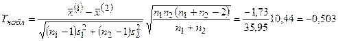 По данным выборок вычисляем наблюдаемое значение статистики Стьюдента