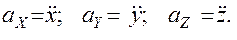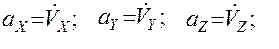 Проекции ускорения точки на оси координат равны первым производным от соответствующих проекций скорости по времени или вторым производным от конечных уравнений движения по времени:
