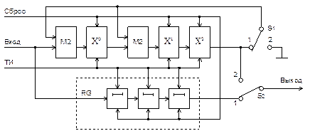 Схема работает следующим образом. В исходном состоянии переключатели S1 и S2 установлены в положение «1». Под действием импульса «Сброс» ячейки памяти обоих регистров устанавливаются в нулевое состояние. Затем на вход кодера посимвольно поступает комбинация, отображающая многочлен