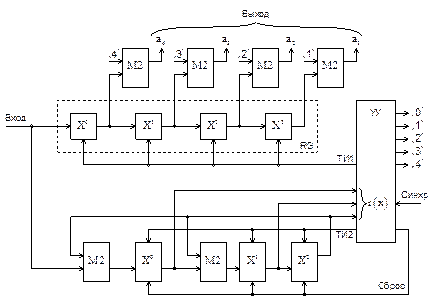 Схема декодера работает следующим образом. Под действием сигнала синхронизации «Синхр.», поступающего на декодер извне, устройство управления УУ вырабатывает импульс «Сброс», устанавливающий ячейки памяти схемы деления в нулевое состояние. Одновременно на выходах УУ появляются тактовые импульсные последовательности ТИ1 и ТИ2. Подлежащий декодированию КВ, начиная со старших разрядов информационной части, поступает одновременно на вход приемного регистра RG и схему деления на образующий многочлен. Через k тактов импульсная последовательность ТИ1 на выходе УУ исчезает и регистр RG переходит в режим хранения информационной части КВ, а ТИ2 сохраняется и деление продолжается еще в течение m тактов. По истечении n тактов устройство управления анализирует остаток