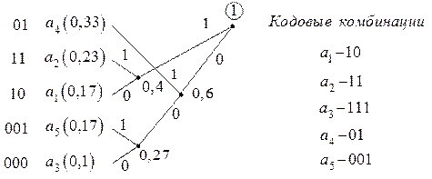 . Располагаем подлежащие кодированию знаки в порядке убывания вероятностей и строим кодовое дерево.