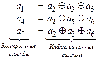Для любой информационной части равенства (2.17) достигаются путем подбора контрольных разрядов, в качестве которых выбираются разряды, встречающиеся только в одной проверке. Таковыми являются 1, 4 и 7 разряды (соответствуют столбцам контрольной матрицы