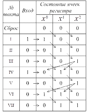 Чтобы проследить работу схемы, составим таблицу состояний ячеек регистра.