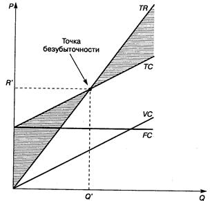 FС—постоянные издержки; VС—переменные издержки; ТС— валовые издержки; R’ — пороговая выручка; Q’ — пороговый объем продаж