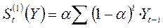 Прогноз на будущее производится по указанной выше формуле. Более сложная форма метода экспотенциального сглаживания заключается в том, что временной ряд сглаживается с помощью взвешенной скользящей средней, в которой веса распределяются по экспотенциальному закону. Такая взвешенная скользящая средняя характеризует значения динамического ряда в конце интервала сглаживания, т. е. является характеристикой последних уровней ряда. Экспотенциальная средняя первого порядка: