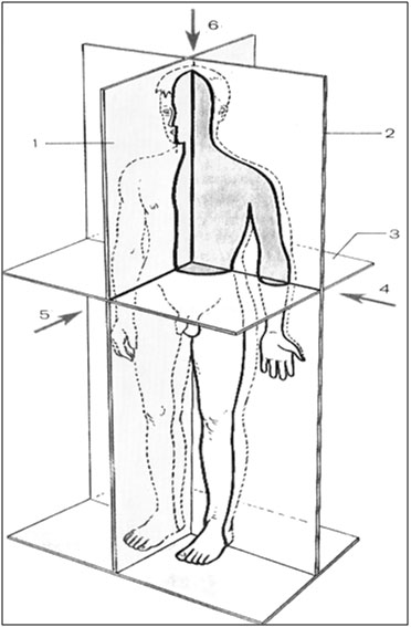 1 – plana sagittalis, сагиттальная плоскость; 2 – plana frontalis, фронтальная плоскость; 3 – plana horisontalis, горизонтальная плоскость; 4 – axis transversus, поперечная ось; 5 – axis sagittalis, сагиттальная ось; 6 – axis verticalis, вертикальная ось.